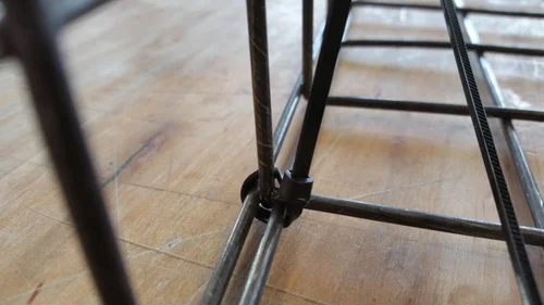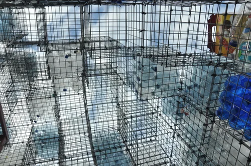 1'x1' welded wire mesh panels are bound together using zip-ties to create modular cubes. The cubes are then attached to one another in order to create the structure. The cubes are filled with bottles and other sorts of plastic containers which have been gathered from the local community.
