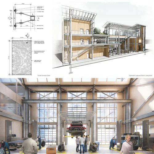 Typically, overlanders are found modifying their vehicles in driveways and gathering in parking lots. There is an abundance of public information available on what gear to use and survival techniques to know. However, all of this can be overwhelming and could result in misinterpretation or catastrophic failure. The facility houses program that engages the public and promotes the sharing of experiences and knowledge as well as the design and fabrication of gear directly for the end-user. The project seeks to establish a place that celebrates the experience of preparing a vehicle and person for overland travel. The goal is to create an urban hub for a growing community that is all about getting out and exploring the world in a responsible way.