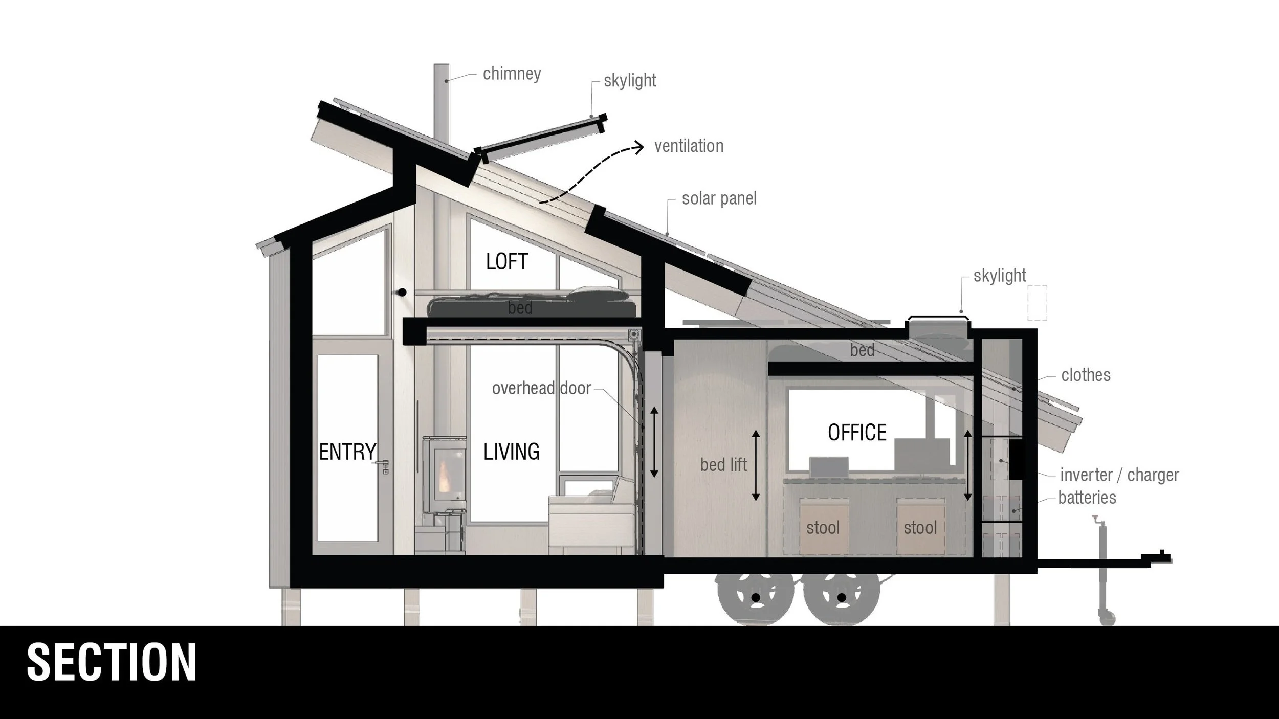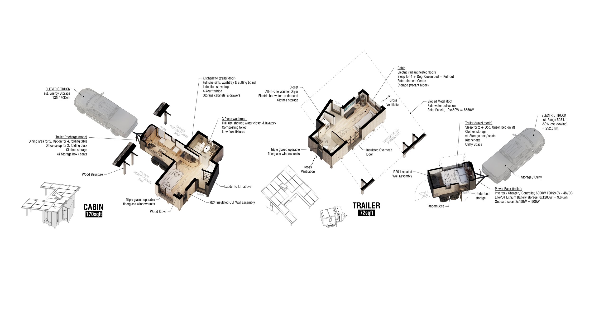 It's clear that electric vehicles will soon replace traditional combustion automobiles. However, a major challenge with electric vehicles is their limited range and towing capacity. Additionally, traditional mobile tiny houses are often heavy and require expensive, heavy-duty towing vehicles, making them inefficient to move. To address these issues, this project proposes a hybrid approach to mobile architecture. The small home base serves as a place to recharge, unwind, and prepare for the next adventure.