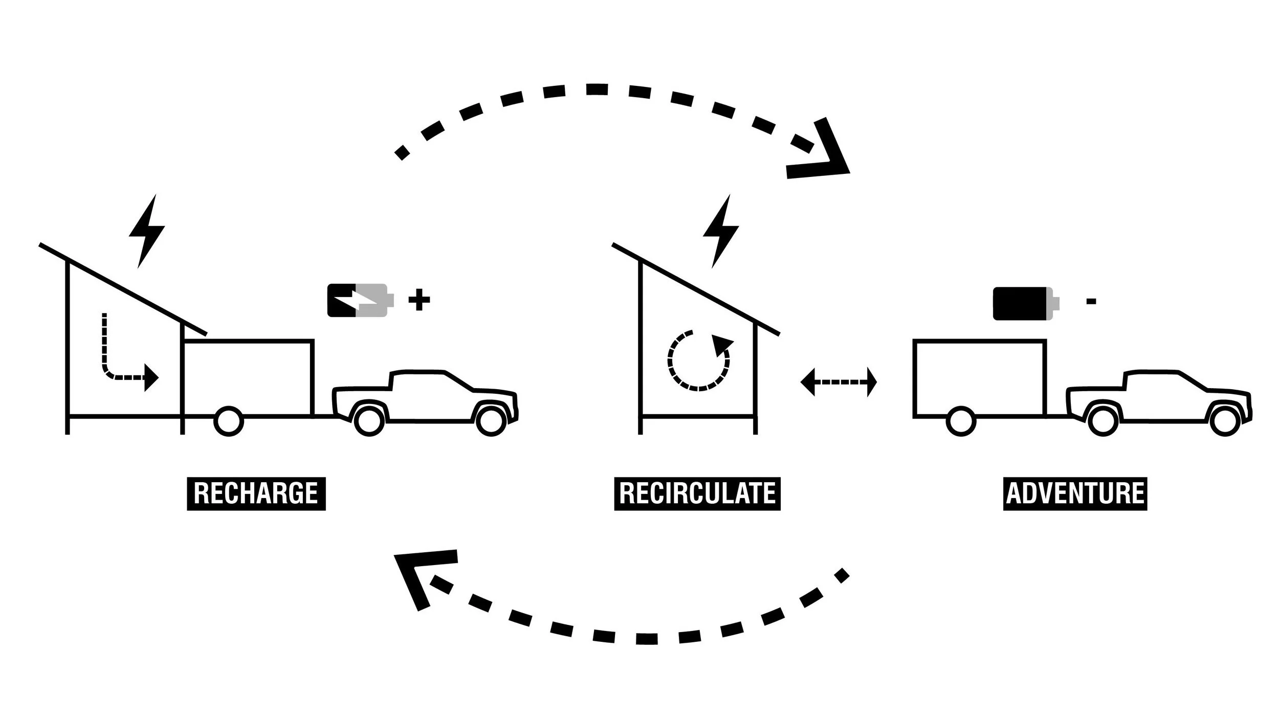 The goal of this project is to enable sustainable and responsible off-grid living by leveraging modern technology, while still maintaining mobility. This is in response to the emergence of Electric Vehicles, which have limitations that can impact mobility, as well as the opportunities that a mobile lifestyle can offer. The project involves two components: a 6’x12’ off-grid mobile dwelling that functions as a "battery," which can be plugged into an 8’x20’ modular home base for charging. The relationship between these two components is symbiotic, with each one supporting the independent lifestyle of an enthusiastic, outdoor adventure couple.