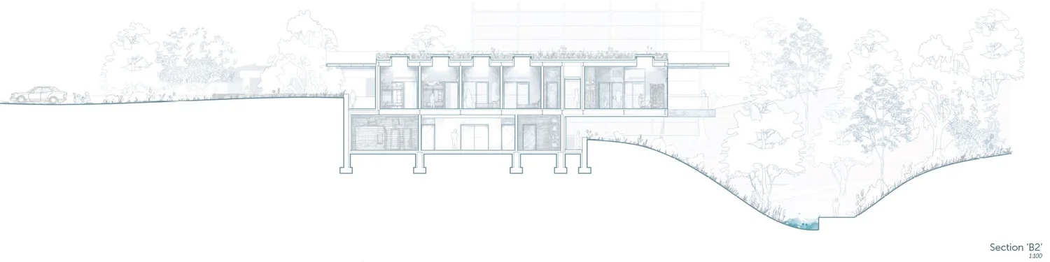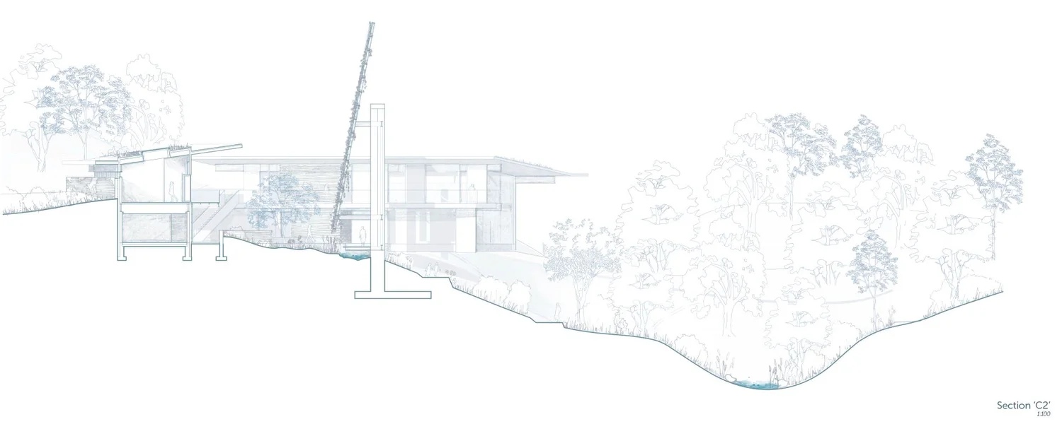 Sketch Section  The Lodge is not just a weekend getaway, but a place to help you find who you are. The design stems from the importance of orientation not only for a sustainability approach but also a holistic one. These orientation “devices” allow